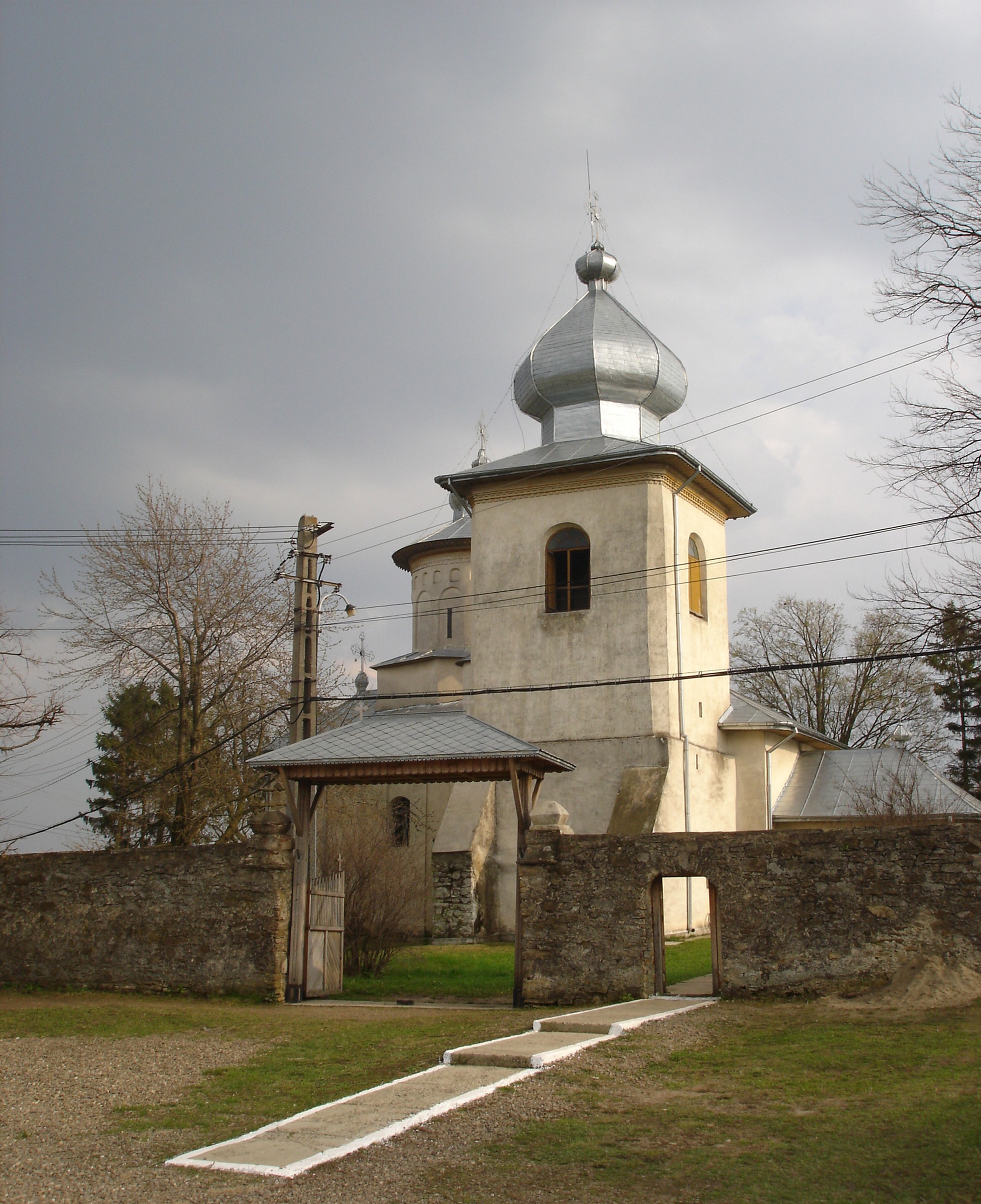 „Biserica veche a satului, precum şi satul a fost peste Siret la locul numit „temelie” unde până acum câţiva ani s-a găsit o piatră, care se zice a fi fost pristolul bisericii. De la alungarea saşilor, care se zice ar fi fost alungaţi de Voievodul Ştefan cel Mare, locuitorii, din cauza vărsăturii Siretului s-au strămutat cu totul pe locul unde se găseşte astăzi satul, ocupând şi biserica ce a rămas de la saşi şi care se găseşte şi astăzi. La ce an şi de cine e zidită această biserică nu se ştie. Bătrânii povestesc că şi lor li s-a spus de alţii, că această biserică, înainte de a fi românească, a fost a saşilor şi, deci, e făcută de ei. Cum a devenit ortodoxă, unde s-au dus saşii ce locuiau pe aici şi din ce pricină, nimeni nu ne poate spune nimic.